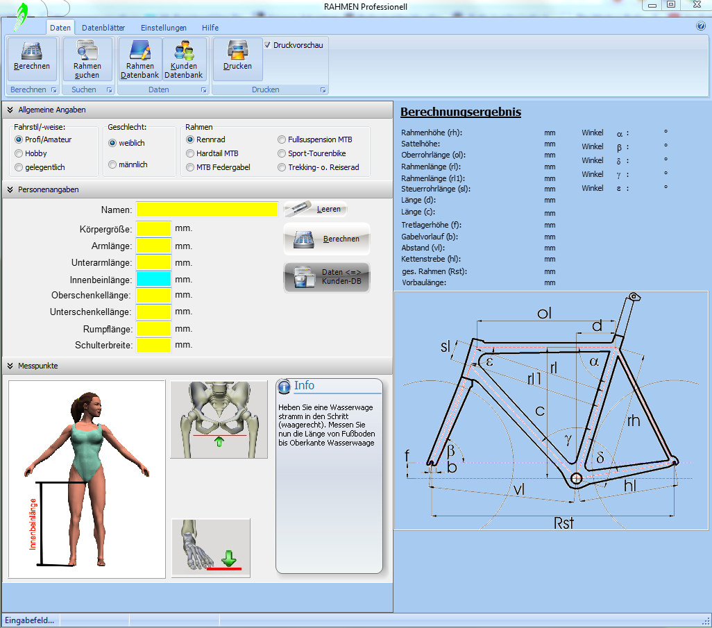 Bei der Berechnung werden wichtige ergonomische Gesichtspunkte berücksichtigt, damit z.B. Rücken– und Knieprobleme durch eine schlechte Haltung beim Rennradfahren nahezu ausgeschlossen werden können.